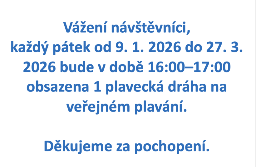 Každý pátek od 9. 1. 2026 do 27. 3. 2026 bude v době 16:00-17:00 obsazena 1 plavecká dráha.